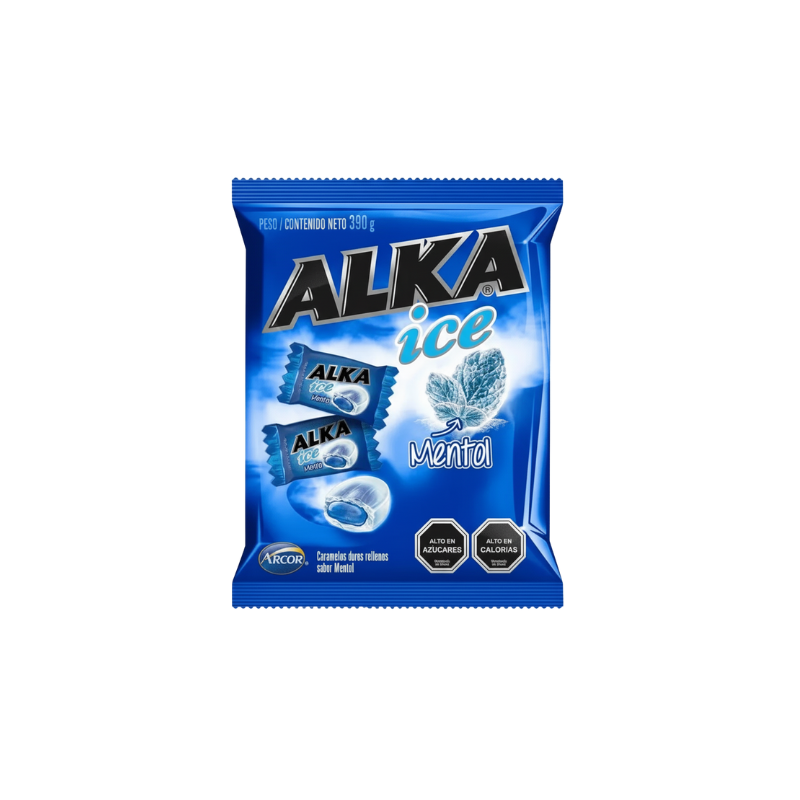 Alka Ice Mentol: Caramelo duro con relleno líquido de mentol. Refrescante, intenso y diferente, ideal para una sensación fresca que dura en cada mordida.